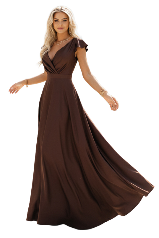 Блестяща сатенена макси рокля на марка Numoco в благороден шоколадов нюанс. Женствена линия с коpertов деколте, фини ръкавчета пеперуди и разрез на крака красиво оформя силуета и перфектно работи по време на танц. Made in Poland - Полско производство.