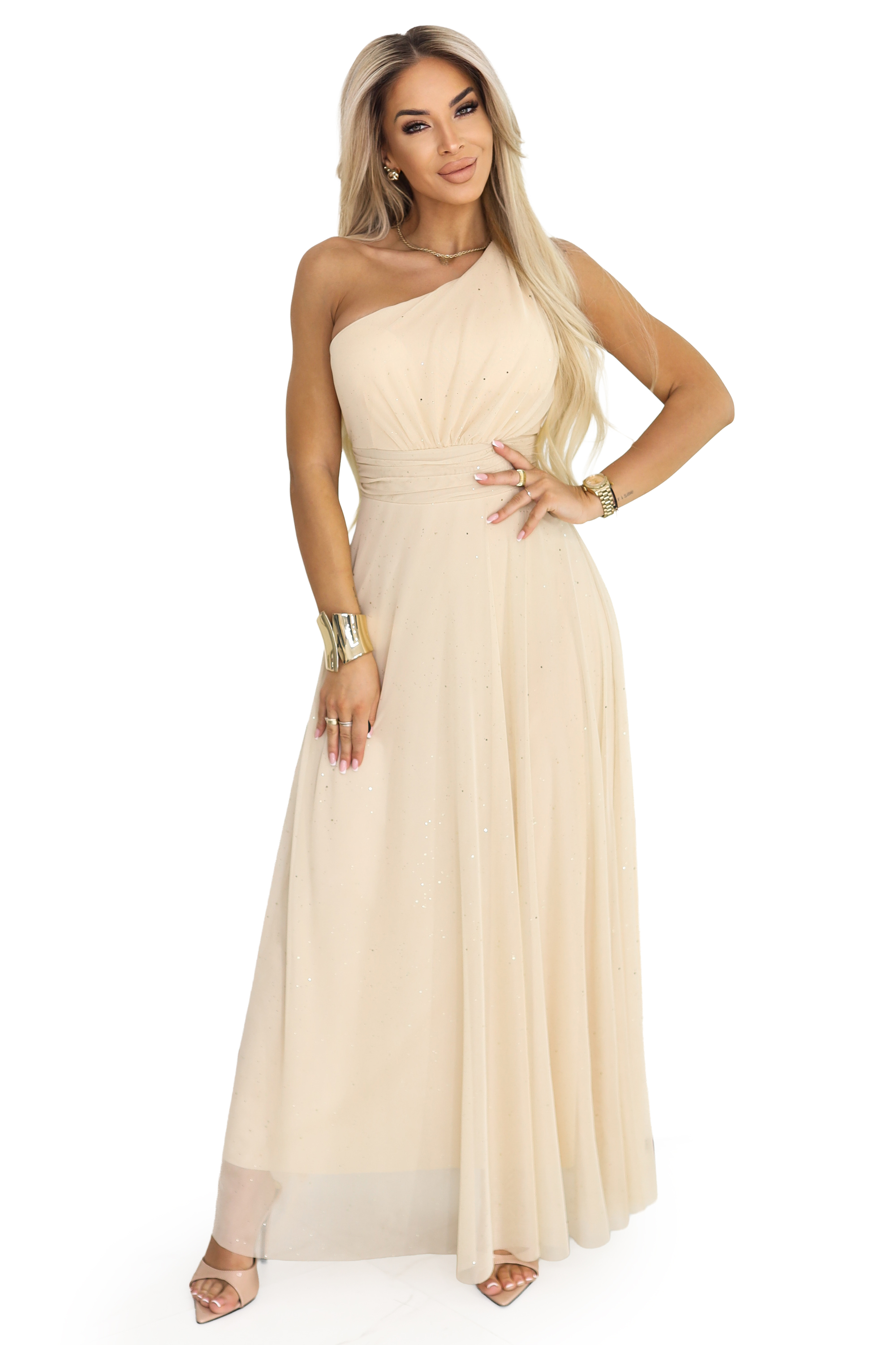 656-2 Дълга, блестяща вечерна рокля с едно рамо - шампанско бежово
