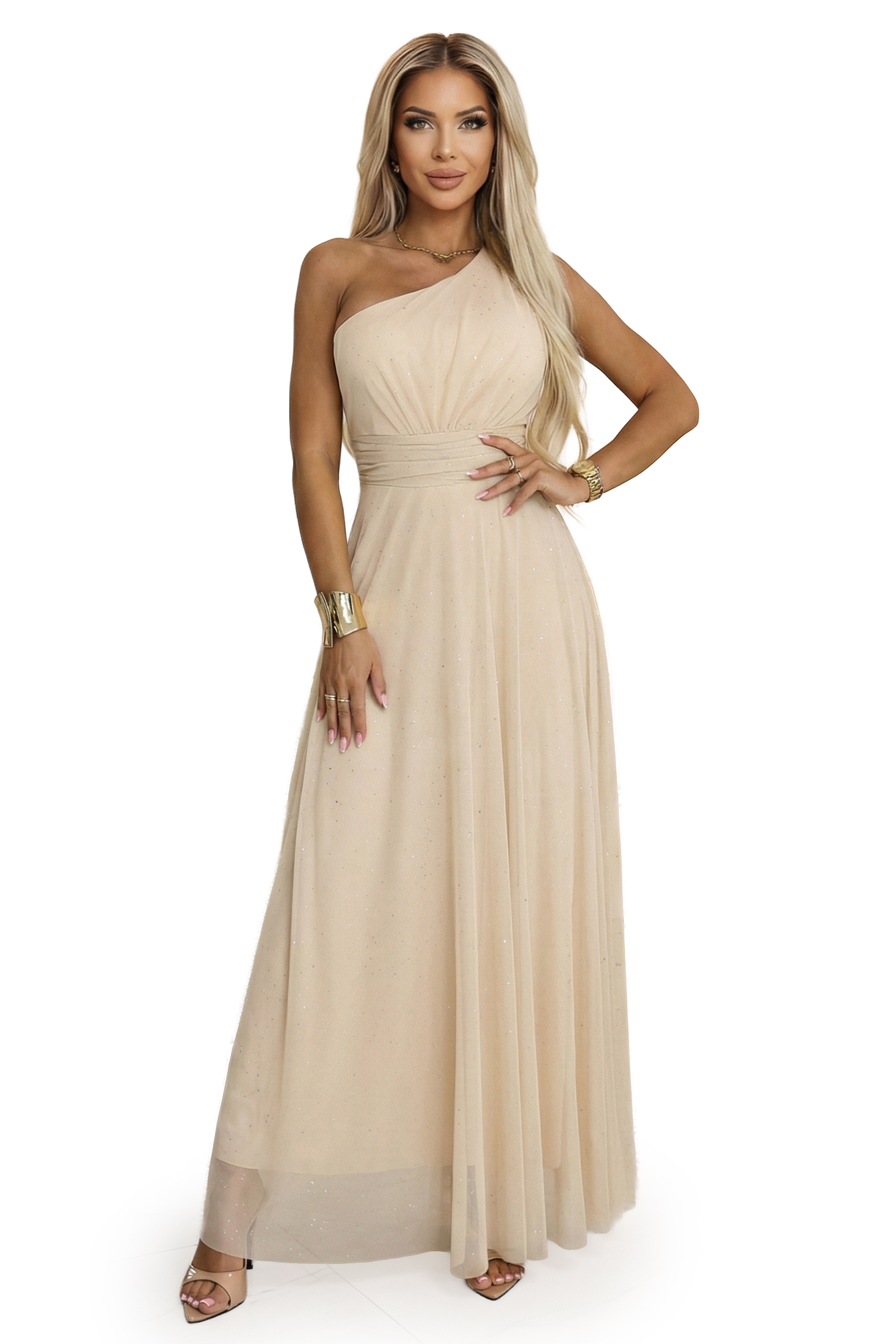Макси рокля на едно рамо в цвят шампанско бежово с фин блясък